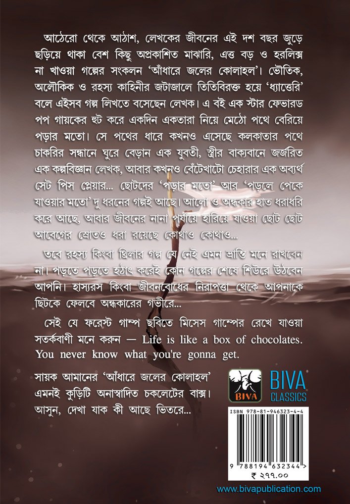 আঠেরো থেকে আঠাশ, লেখকের জীবনের এই দশ বছর জুড়ে ছড়িয়ে থাকা বেশ কিছু অপ্রকাশিত মাঝারি, এত্ত বড় ও হরলিক্স না খাওয়া গল্পের সংকলন ‘আঁধারে জলের কোলাহল’। ভৌতিক, অলৌকিক ও রহস্য কাহিনীর জটাজালে তিতিবিরক্ত হয়ে ‘ধ্যাত্তেরি’ বলে এইসব গল্প লিখতে বসেছেন লেখক। এ বই এক স্টার ফেভারড পপ গায়কের হুট করে একদিন একতারা নিয়ে মেঠো পথে বেরিয়ে পড়ার মতো। সে পথের ধারে কখনও এসেছে কলকাতার পথে চাকরির সন্ধানে ঘুরে বেড়ান এক যুবতী, স্ত্রীর বাক্যবানে জর্জরিত এক কল্পবিজ্ঞান লেখক, আবার কখনও বেঁটেখাটো চেহারার এক অব্যর্থ সেট পিস প্লেয়ার… ছোটদের ‘পড়ার মতো’ আর ‘পড়লে পেকে যাওয়ার মতো’ দু ধরনের গল্পই আছে। আলো ও অন্ধকার হাত ধরাধরি করে আছে, আবার জীবনের নানা পর্যায়ে হারিয়ে যাওয়া ছোট ছোট আবেগের স্রোতও ধরা রয়েছে কোথাও কোথাও…