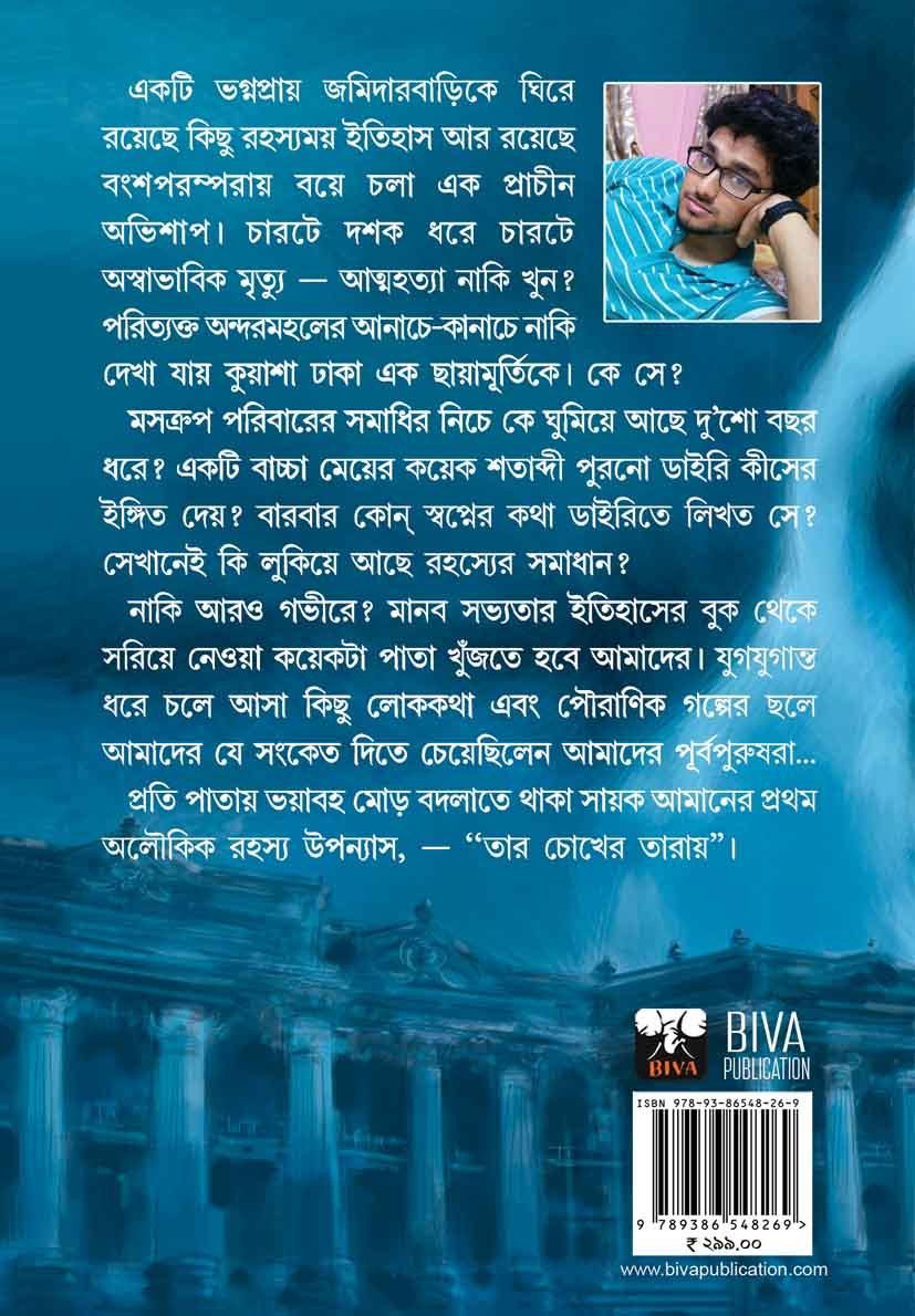 একটি ভগ্নপ্রায় জমিদারবাড়িকে ঘিরে রয়েছে কিছু রহস্যময় ইতিহাস আর রয়েছে বংশপরম্পরায় বয়ে চলা এক প্রাচীন অভিশাপ। চারটে দশক ধরে চারটে অস্বাভাবিক মৃত্যু – আত্মহত্যা নাকি খুন? পরিত্যক্ত অন্দরমহলের আনাচে কানাচে নাকি দেখা যায় কুয়াশা ঢাকা এক ছায়ামূর্তিকে। কে সে? মসক্রপ পরিবারের সমাধির নিচে কে ঘুমিয়ে আছে দুশো বছর ধরে? একটি বাচ্চা মেয়ের কয়েক শতাব্দী পুরনো ডাইরি কীসের ইঙ্গিত দেয়? বারবার কোন স্বপ্নের কথা ডাইরিতে লিখত সে? সেখানেই কি লুকিয়ে আছে রহস্যের সমাধান? নাকি আরও গভীরে? মানব সভ্যতার ইতিহাসের বুক থেকে সরিয়ে নেওয়া কয়েকটা পাতা খুঁজতে হবে আমাদের। যুগযুগান্ত ধরে চলে আসা কিছু লোককথা এবং পৌরাণিক গল্পের ছলে আমাদের যে সংকেত দিতে চেয়েছিলেন আমাদের পূর্বপুরুষরা… জুলাই-এ আসছে, প্রতি পাতায় ভয়াবহ মোড় বদলাতে থাকা সায়ক আমানের অলৌকিক রহস্য উপন্যাস, — “তার চোখের তারায়”।